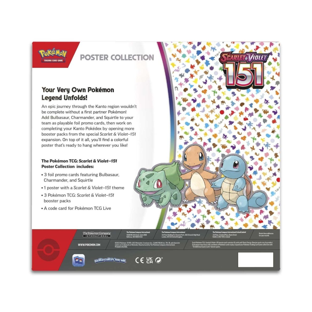 An epic journey through the Kanto region wouldn’t be complete without a first partner Pokémon! Add Bulbasaur, Charmander, and Squirtle to your team as playable foil promo cards, then work on completing your Kanto Pokédex by opening more booster packs from the special Scarlet & Violet—151 expansion. On top of it all, you’ll find a colorful poster that’s ready to hang wherever you like!