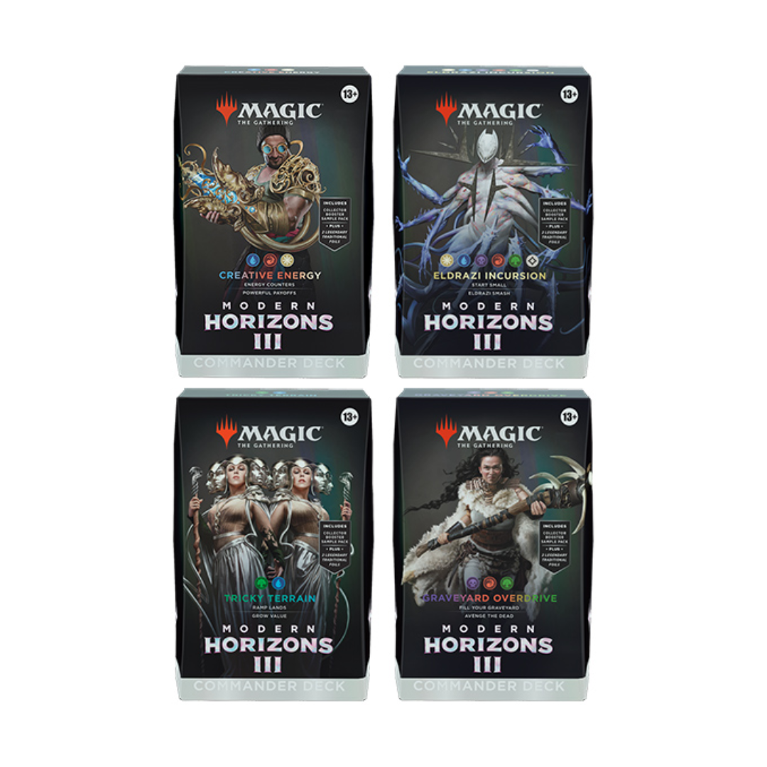 Includes one of each Commander Deck (Graveyard Overdrive, Eldrazi Incursion, Tricky Terrain, Creative Energy).