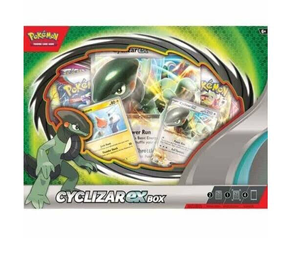 Coast into your next Pokémon TCG match with the support of Cyclizar ex! The helpful Mount Pokémon is ready to roll onto the battlefield with its crafty Power Run attack. With it, you can do damage and search your deck for a Basic Energy to attach to Cyclizar ex. When you’re ready to bring it home, use Full Throttle and slide into big damage! You’ll also find a helpful foil card featuring Rotom and 4 booster packs to add to your collection.