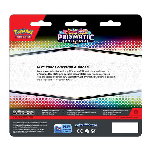 Expand your collection with a foil Pokemon TCG card featuring Eevee with a Pokemon Day 2025 logo! You also get a metallic coin, two booster packs from the special Pokemon TCG: Scarlet & Violet—Prismatic Evolutions expansion, and a code card for Pokemon TCG Live!
