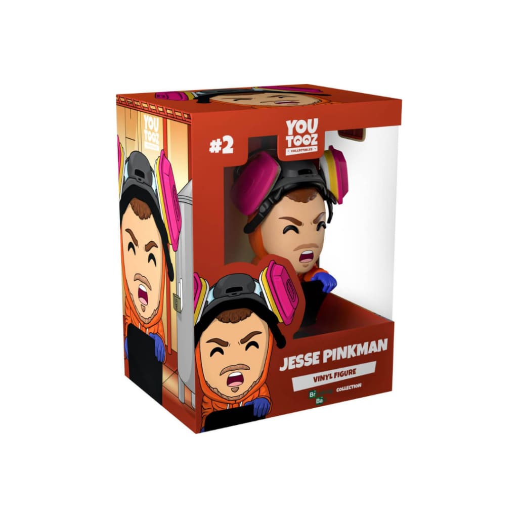Let’s cook already! So you’re chasing around a fly, and in your world I’m the idiot? At a height of 4.9 inches, this detailed collectible sees Jesse Pinkman wearing an orange hazmat suit, blue skin tight gloves and white and black sneakers. Over the top of his head is his respirator mask, which is sculpted in detailed and uses a transparent material for the visor portion. The window box features a scene out of the secret meth lab where Jesse is zoomed with dreams of freedom on his office chair.