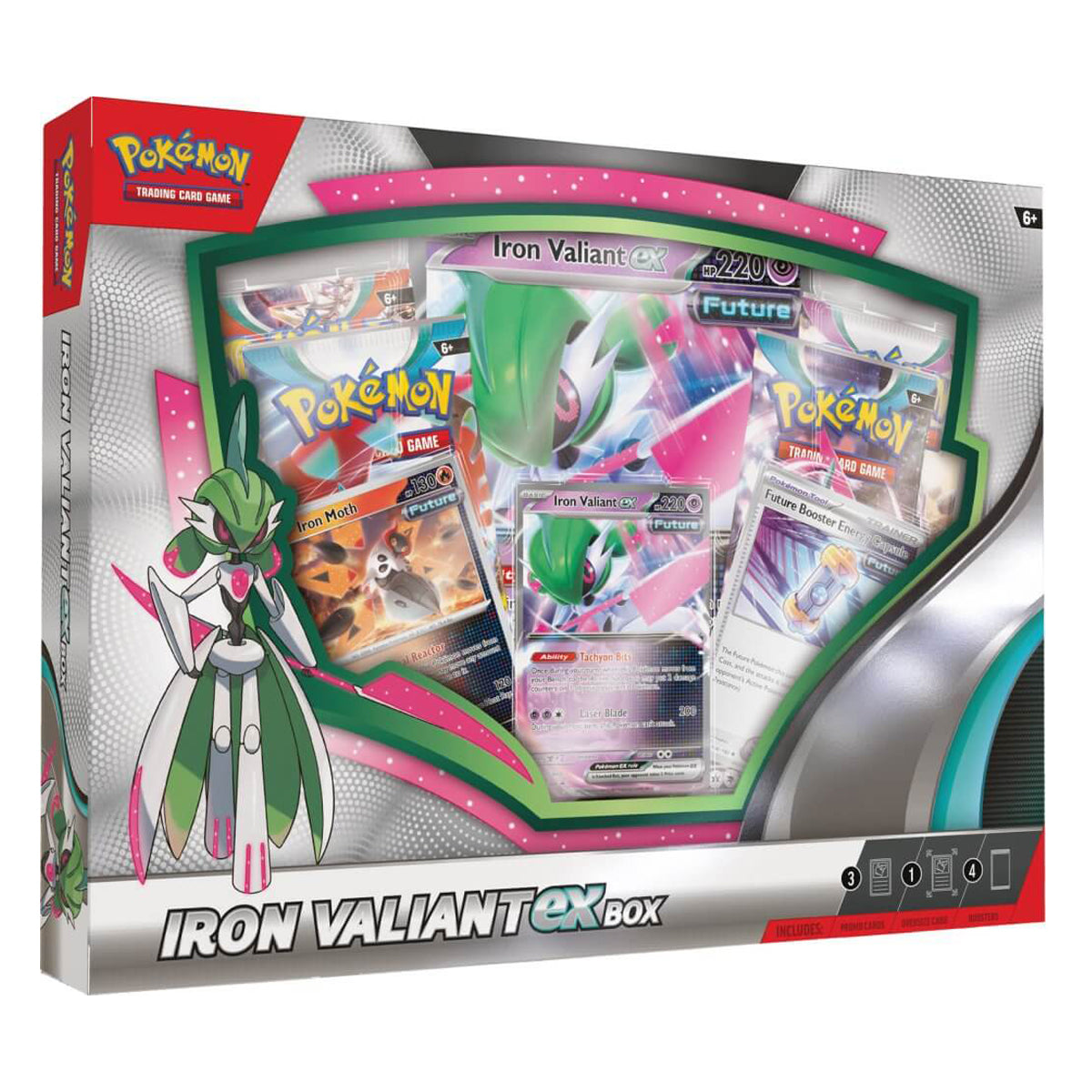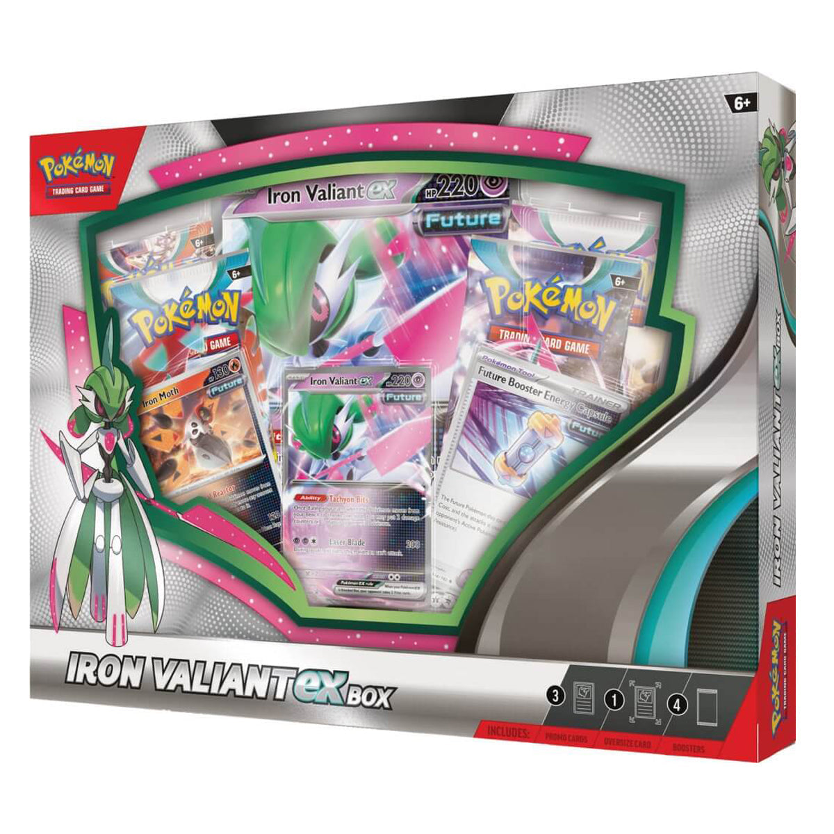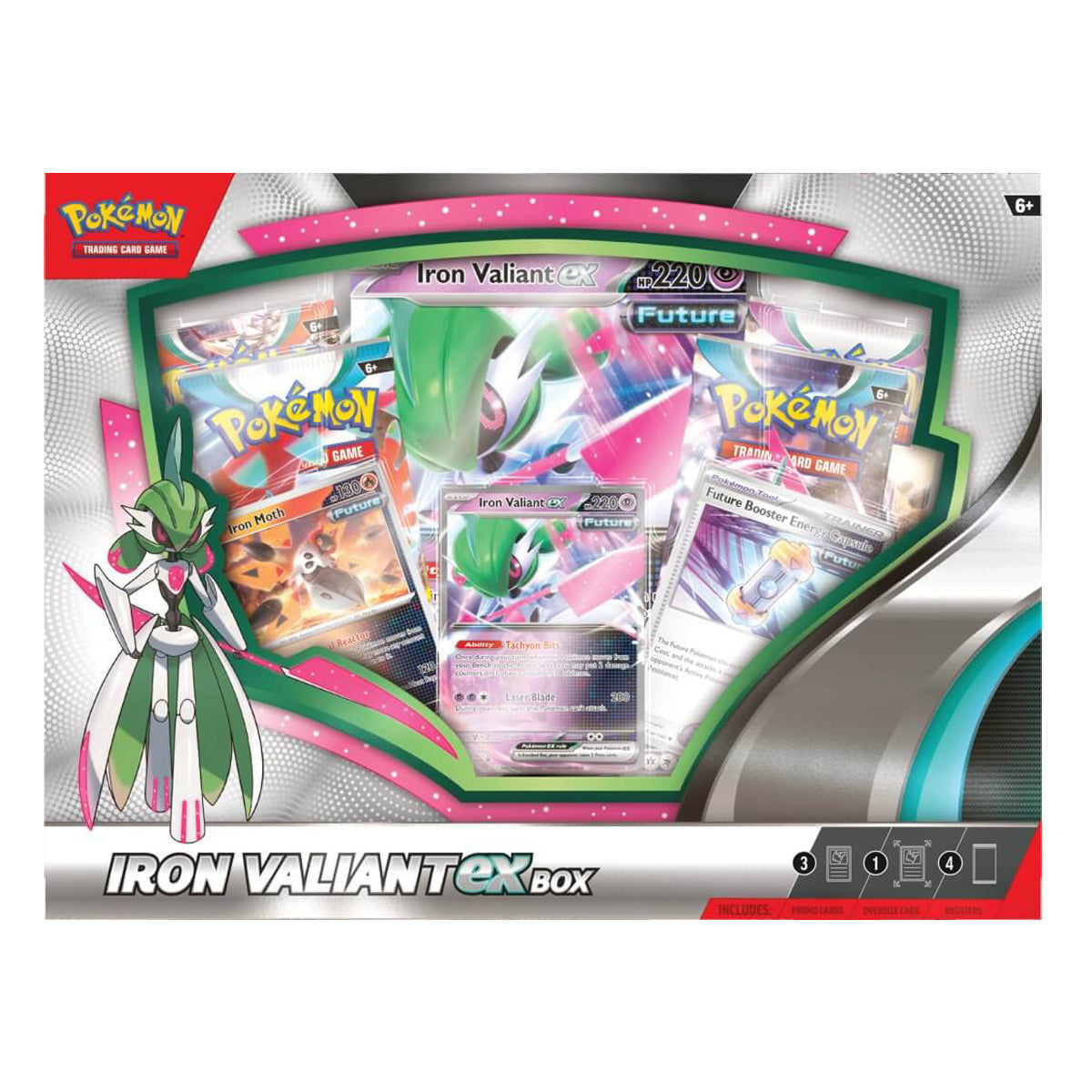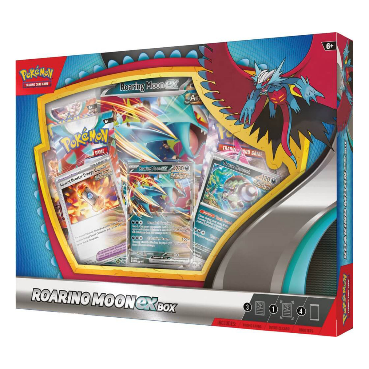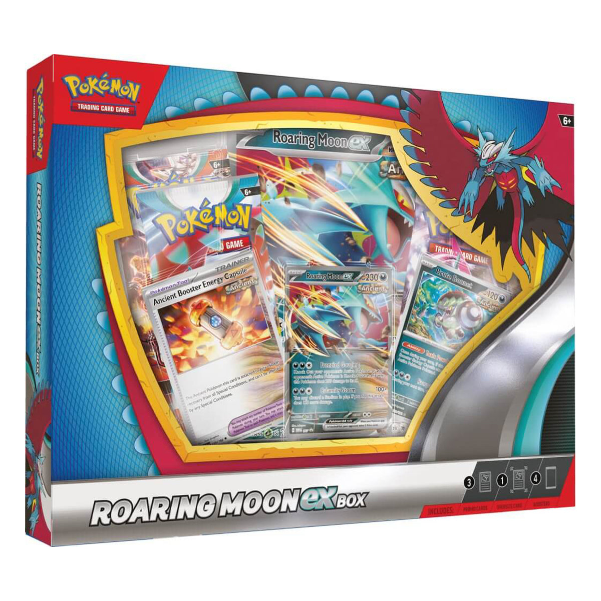 Awakening from a long-gone world is the ferocious Roaring Moon ex—while the resilient Iron Valiant ex beams in from the future! In this box, you get a promo card and an oversize card featuring either Roaring Moon ex or Iron Valiant ex. Roaring Moon ex is joined by Brute Bonnet and an Ancient Booster Energy Capsule, and Iron Valiant ex comes with Iron Moth and a Future Booster Energy Capsule all things that your past self would want you to have to help you out in the future. Find even more helpful allies in the included Pokémon TCG booster packs!